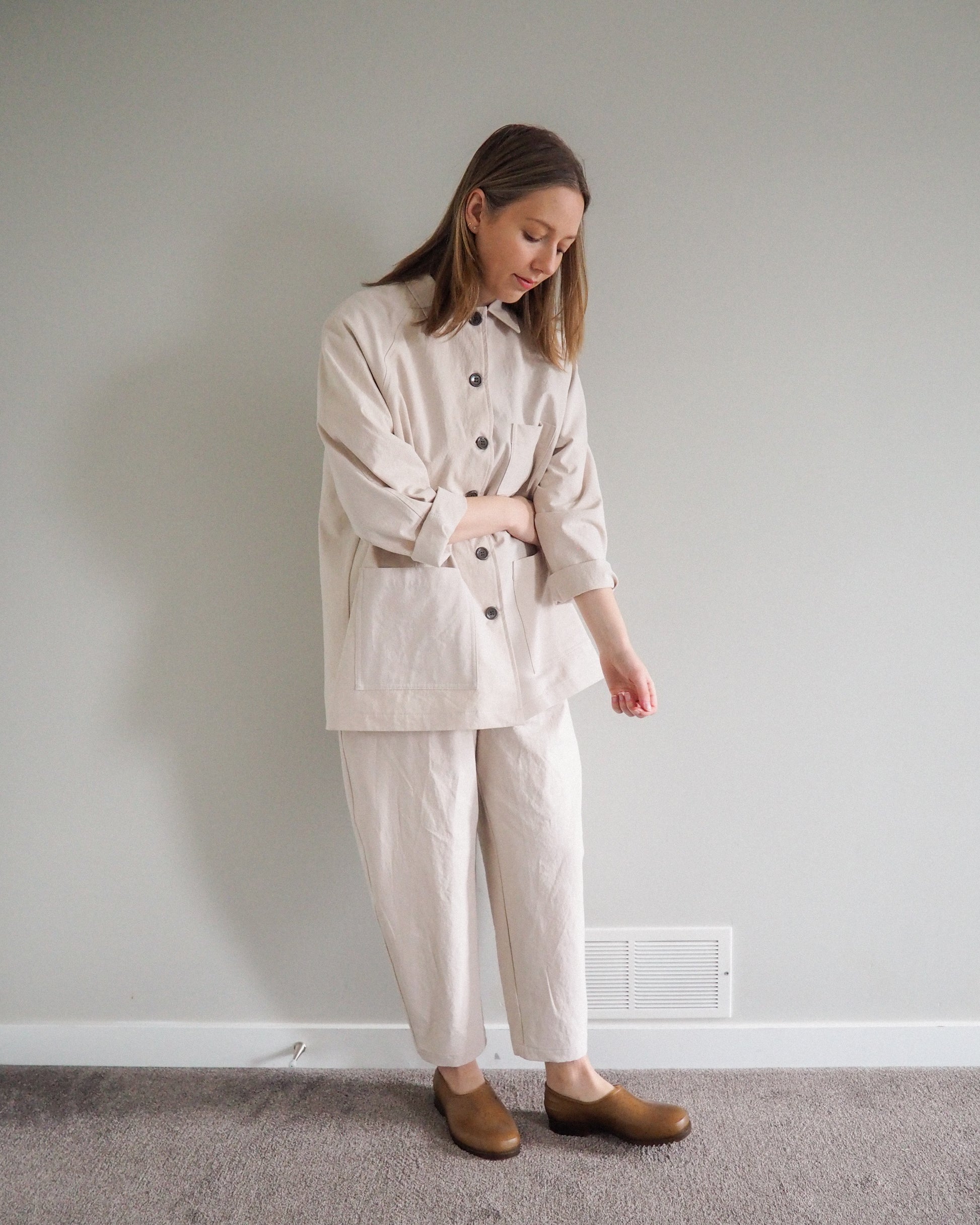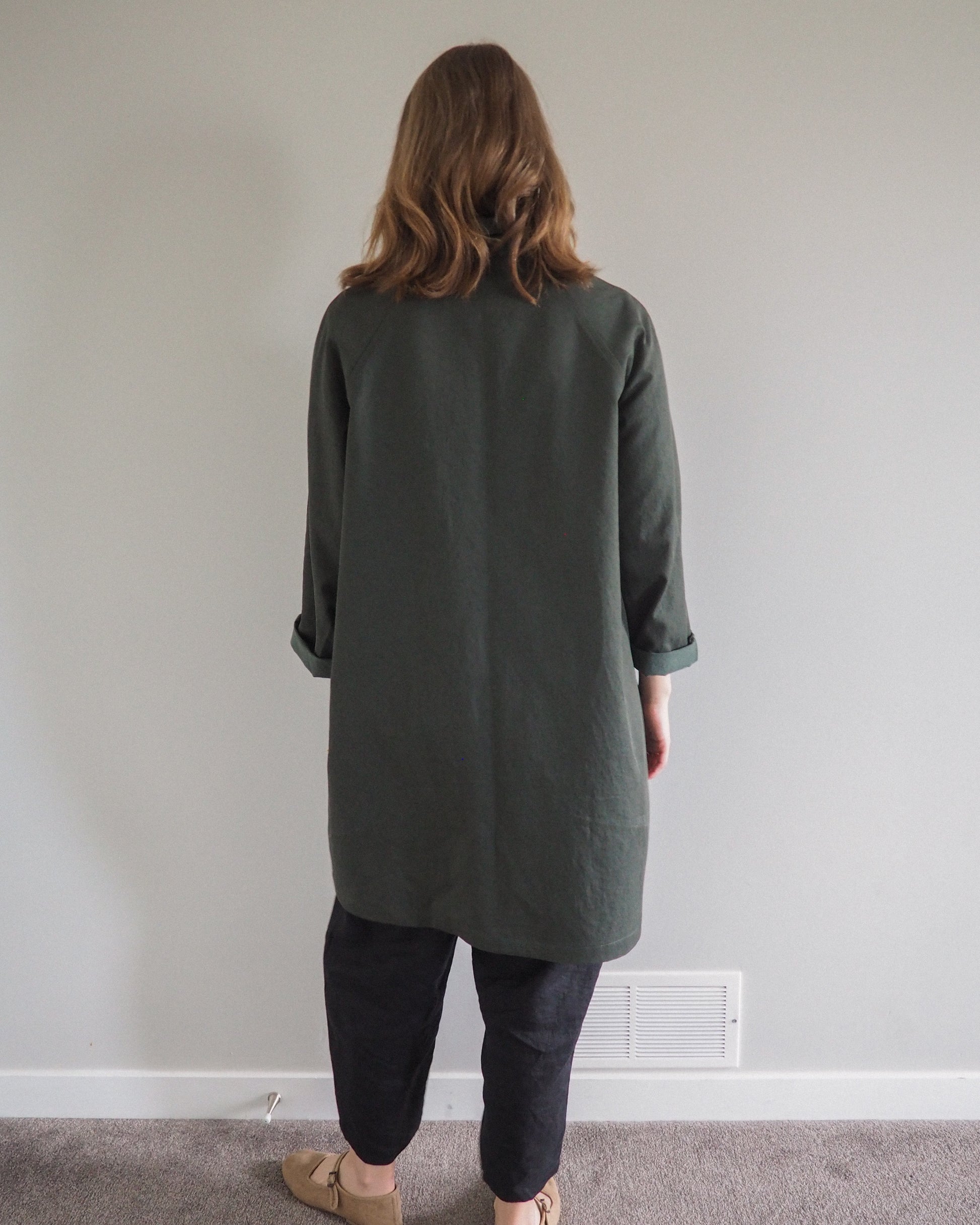 The Marzipan Maker’s Coat is my take on a chore coat loosely inspired by vintage painter’s smocks. It is unlined and features simple and clean lines, raglan sleeves, a roomy A-line fit, and patch pockets for all of your tools & knick-knacks. There are three lengths to choose from: View A is cropped at the high hip; View B is mid-length and hits below the hip; View C is long and hits just above the knee.